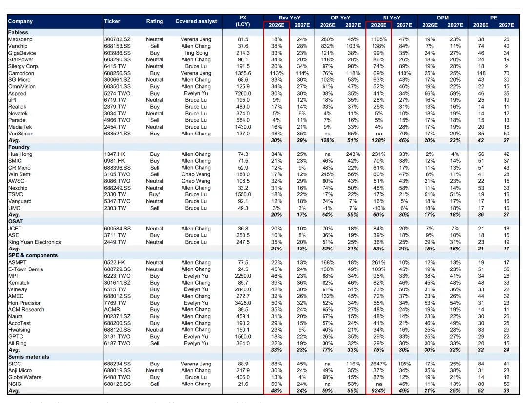 除晶圆代工厂板块外,我们预计覆盖范围内的部分先进封装和人工智能测试企业 2026 年将实现强劲增长,支撑因素包括人工智能芯片数量增加、芯片封装尺寸扩大、芯片测试时间延长、芯片热设计功耗(TDP)提高以及系统级测试(SLT)的广泛采用。总体而言,我们偏好买入评级标的:1)关键人工智能测试和先进封装提供商日月光半导体(3711.TW),预计其先进制程营收 2026 年将加速增长,利润率大幅扩张;2)主导最终测试Handler 市场的鸿海精密(7769.TW),预计随着芯片数量增加和测试时间延长,其 Handler / 自动测试设备(ATC)需求将激增;3)关键人工智能 ASIC 探针卡供应商欣兴电子(6223.TWO),持续受益于每块探针卡引脚数增加以及从垂直探针卡(VPC)向微机电系统(MEMS)探针卡的升级;4)关键人工智能 GPU/ASIC 测试插座供应商赢创(6515.TW),预计通过 HyperSocket 在现有客户中拓展新的总潜在市场,将迎来又一个创纪录的增长年;5)先进封装湿法清洗设备主要供应商 GPTC(3131.TWO),预计 2026 年随着 CoWoS、系统级集成电路(SoIC)和扇出型面板级封装(FOPLP)的扩张,设备出货量将增长。