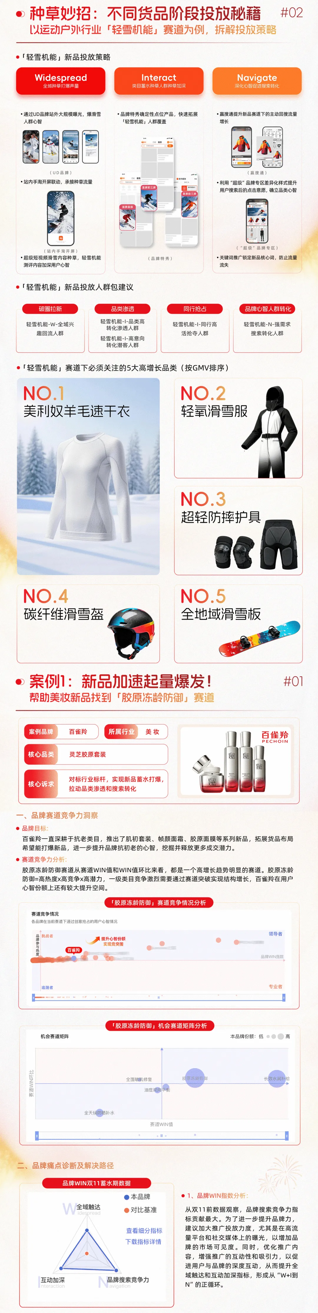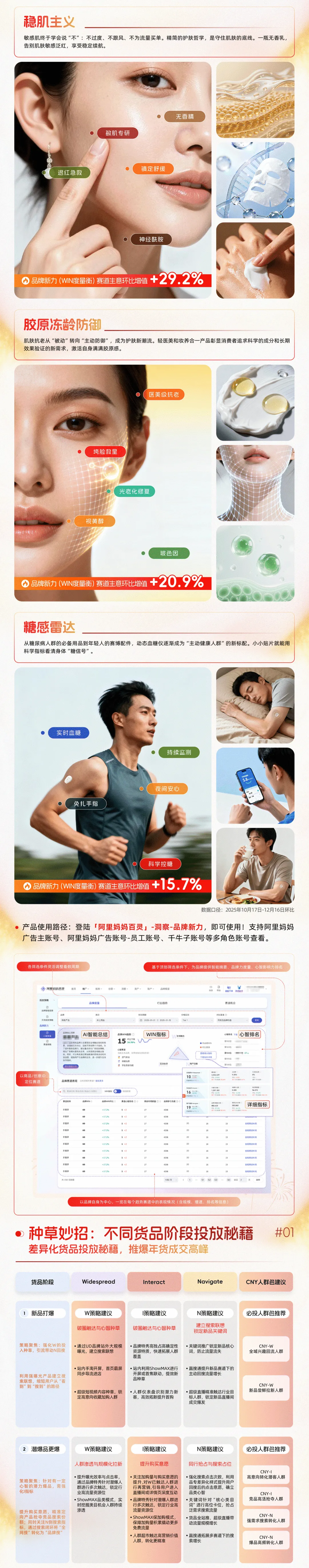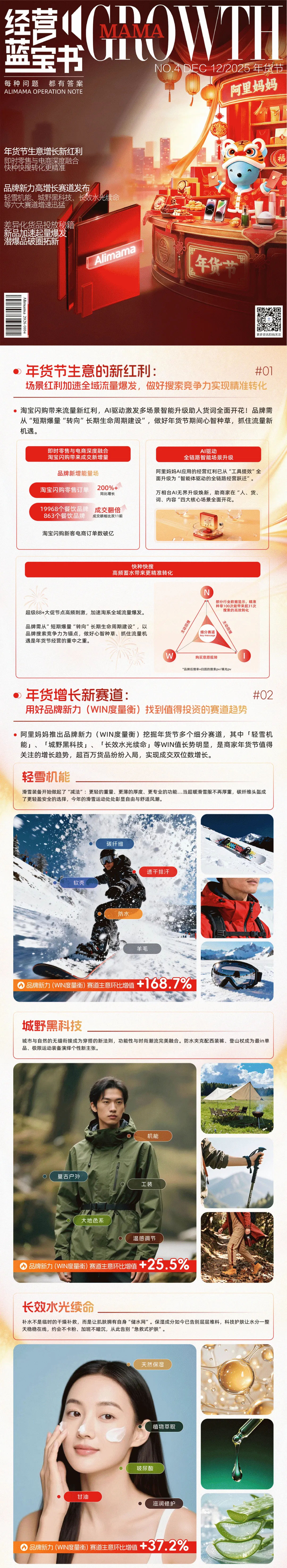 阿里妈妈品牌新力(WIN度量衡)发布「轻雪机能」、「城野黑科技」、「长效水光续命」等6大年货节高增长赛道,并通过新品、爆品的分阶段策略拆解,为品牌提供更系统、更精细的经营解决路径。