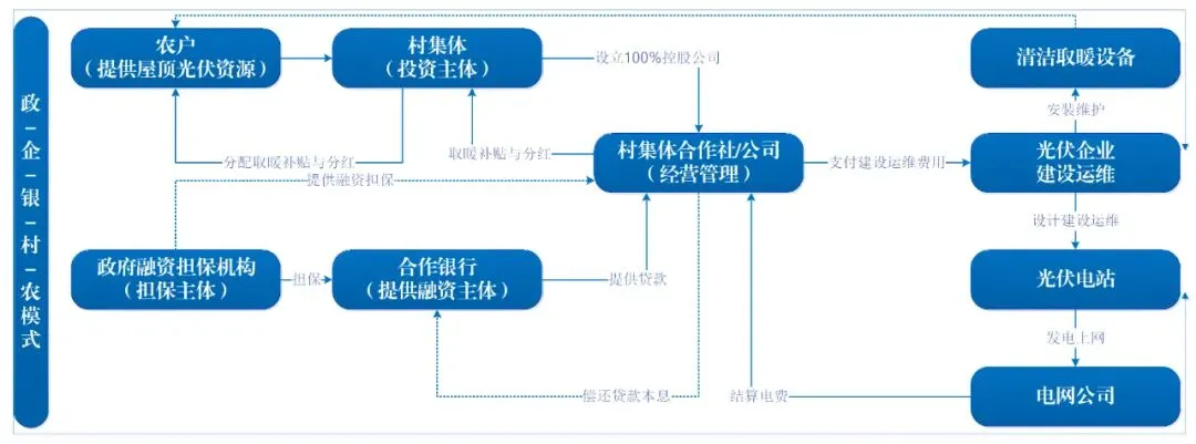 模式特点:由政府背书、担保,金融机构提供贷款,能源企业(隆基绿能)实施,村集体成立全资公司作为业主,农户以屋顶入股。实现农户“零出资、零负债”,享受清洁取暖与发电分红。