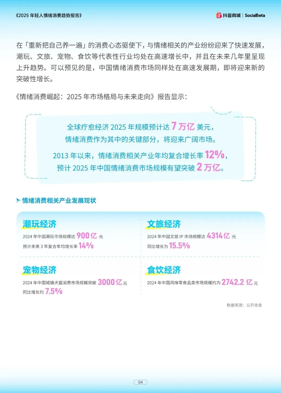报告基于抖音商城数据与第三方调研,指出“情绪价值”已取代单纯性价比,成为驱动年轻人消费的第一动因。2025年中国情绪消费市场规模预计突破2万亿元,2013-2025年相关产业年复合增速12%。调研显示88.2%的年轻人自认“有压力”,其中60.3%把“情绪纾解”列为首要消费动机,近三成支出投向兴趣领域。报告将情绪消费拆分为五大场景——解压、治愈、猎奇、发疯、玄学——并给出代表性商品与人群画像,为品牌提供“短平快”情绪营销路线图。