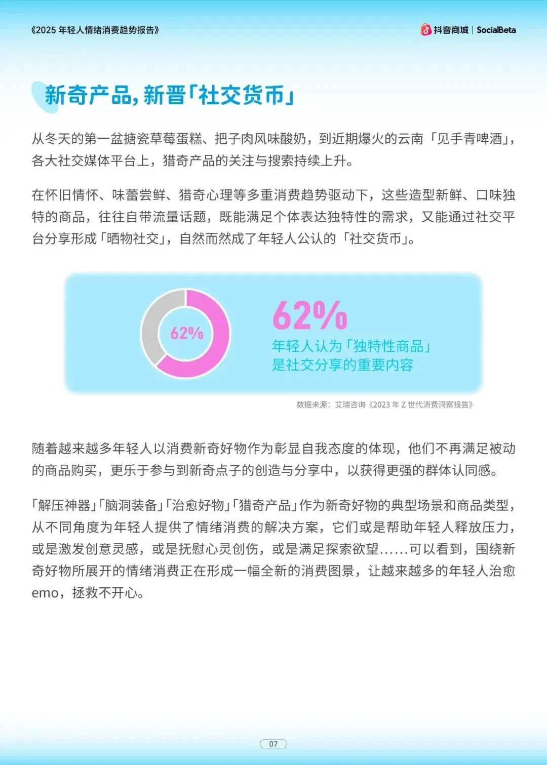 4. 猎奇产品:62% Z世代认为“独特性商品”是社交货币;云南“见手青啤酒”上线3天搜索量环比+470%。