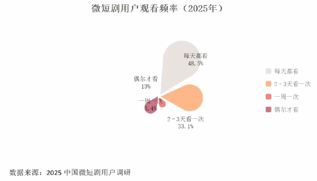 2025年的微短剧市场已形成一个以“日活型”用户为核心的成熟、高粘性消费市场。近半数用户(48.5%)处于“每天都看”的高频消费状态。结合“2-3天看一次”的用户(33.1%),超过八成用户(81.6%) 的观看频率在每周一次以上。这明确表明,微短剧已深度融入大部分用户的日常生活,成为一种高频、习惯性的娱乐消费,其“追更”和即时满足的产品特性成功地塑造了强大的用户粘性。