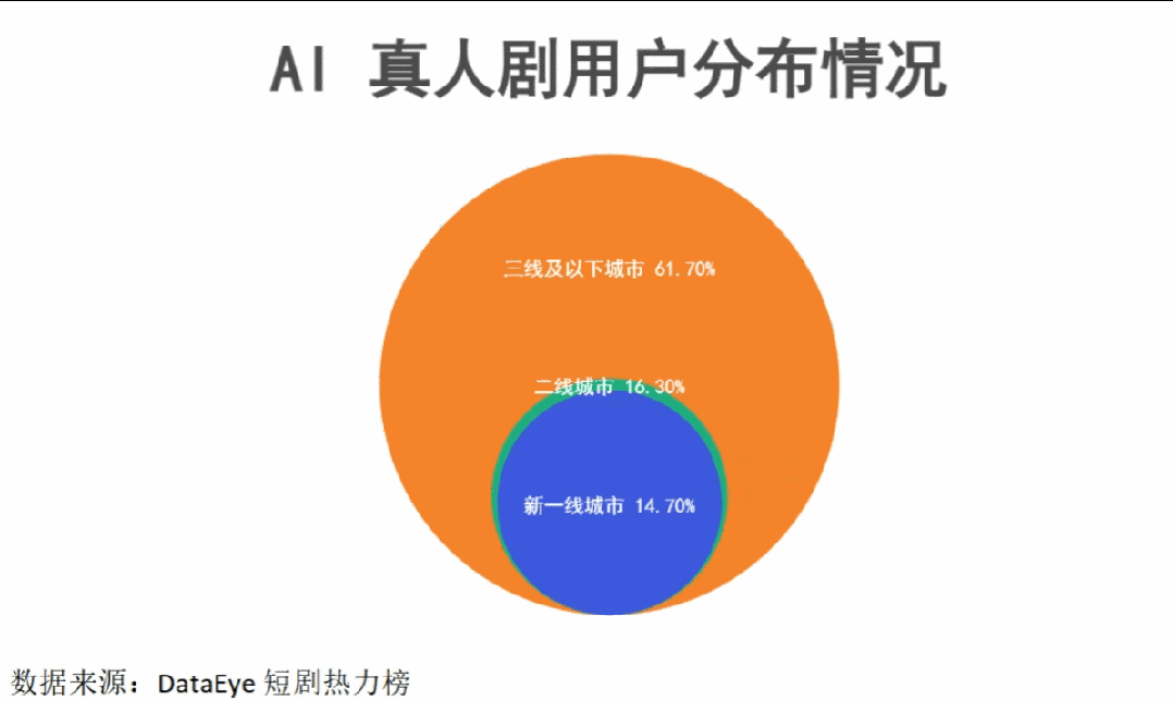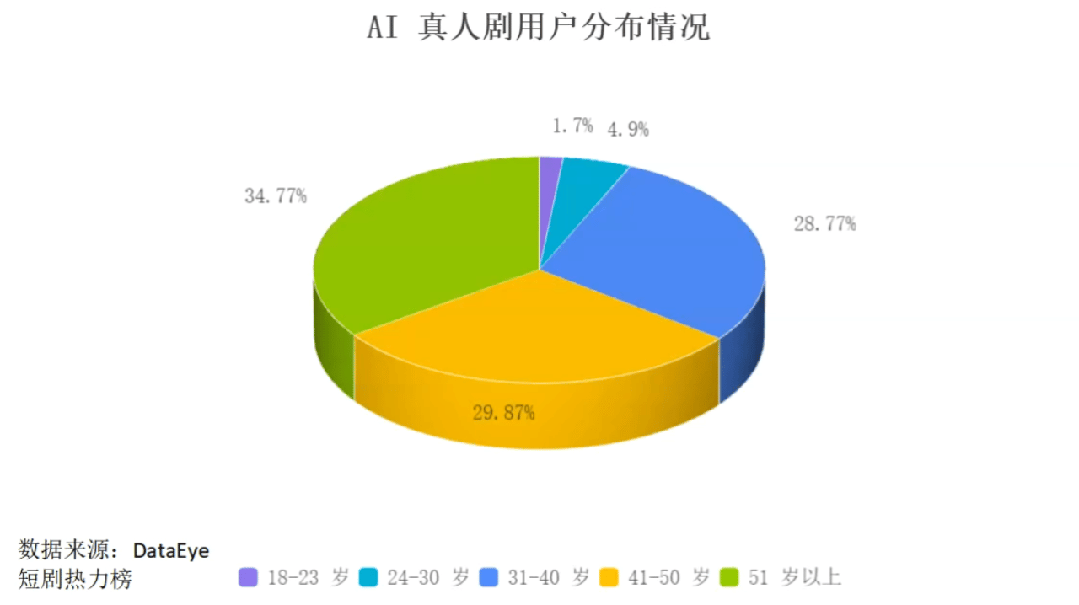 随着多项技术瓶颈被攻克,AI 真人剧5于2024 年下半年实现关键突破,并已建立起覆盖面广且结构鲜明的用户基础。数据显示,AI真人剧用户年龄情况中,中老年群体是绝对主力,51岁以上用户占比 34.8%为最大的年龄群体。