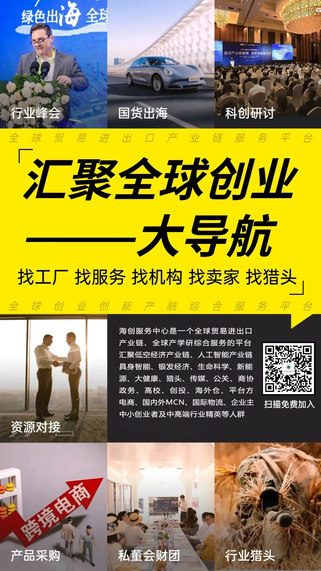 海创汇"HaichuangHui"是一个全球贸易进出口产业链服务、全球产学研综合服务的平台,汇聚国内各行业工厂、外贸、低空经济产业链、出海卖家、商协会、机构、政务、高校、猎头、物流、海外仓、创业园、创投、人工智能产业链、品牌方、大健康、平台方、海外MCN以及国内外模特/网络红人等人群。