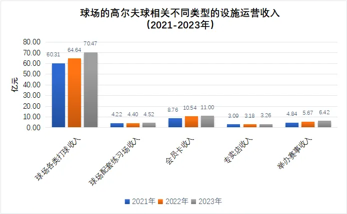 在球场运营收入分布上,打球收入贡献最多,2021年总额约为60.31亿元,2022年64.64亿元,2023年70.47亿元,近三年呈上升趋势。其次是会员费收入,总额约为2021年8.76亿元,2022年10.54亿元,2023年11.00亿元,同样近三年呈上升趋势。然后依次为举办赛事收入、球场配套练习场收入、专卖店收入等。
