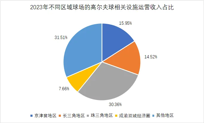 从区域来看,2023年,珠三角地区球场的高尔夫球相关设施运营收入在全国占比最高,达到30.36%,其次是京津冀地区占比为15.95%,再次是长三角地区占比为14.52%,成渝双城经济圈收入占比为7.66%。