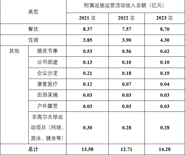 高尔夫球场的运营收入主要分为两方面,一方面是由高尔夫球相关设施产生的运营收入,另一方面是由附属设施产生的运营收入。