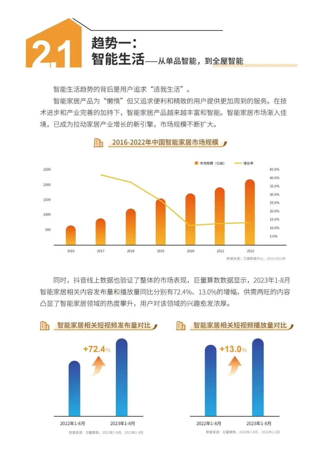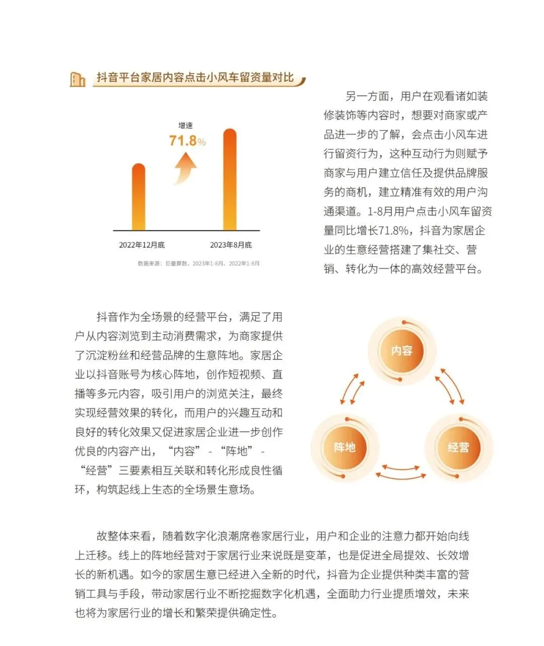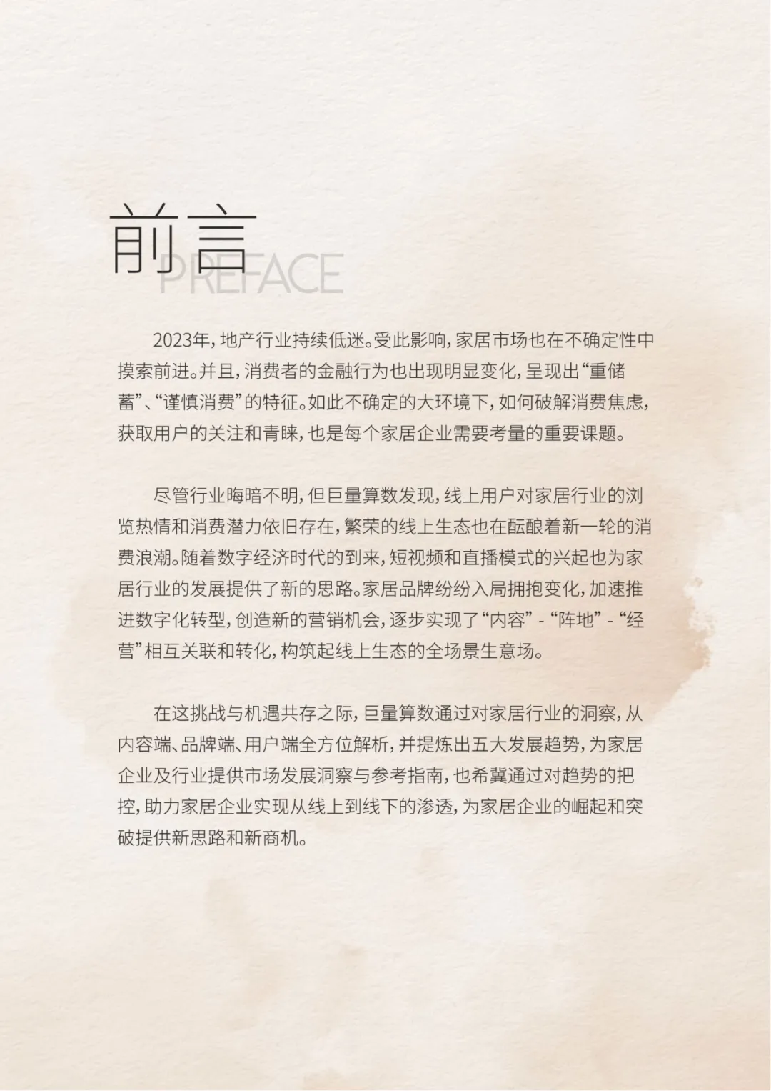 2023 年,受房地产行业和用户理性消费等因素影响,中国家居市场不确定性逐渐凸显。而线上用户对家居行业的热情和消费潜力依旧存在,繁荣的生态也在酝酿着新一轮的消费浪潮。在该浪潮下,家居企业品牌也借助抖音等新媒体平台构筑起线上生态的全场景生意场,实现企业的长效经营和品牌价值的持续传递。
