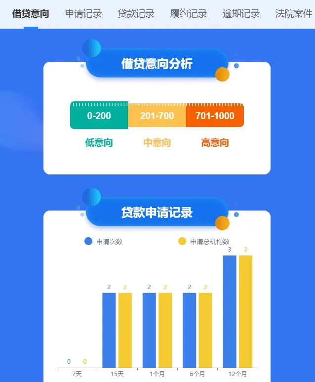 1、大数据分数,满分100分,60分为分界线,分数越低,说明大数据越不好,能申请到贷款的概率越小。 2、申请记录次数:次数越好越好,一些未接入央行的小机构,也会在大数据报告里体现。