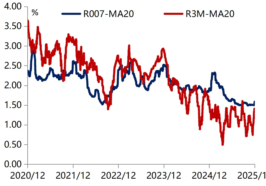 跨年资金有所收敛。本周共有6227亿元逆回购到期,央行在公开市场共开展13601亿元逆回购操作。截至12月31日,7天回购利率R007的加权利率为2.16%。截至12月31日,质押式回购日成交规模降至4.2万亿元。