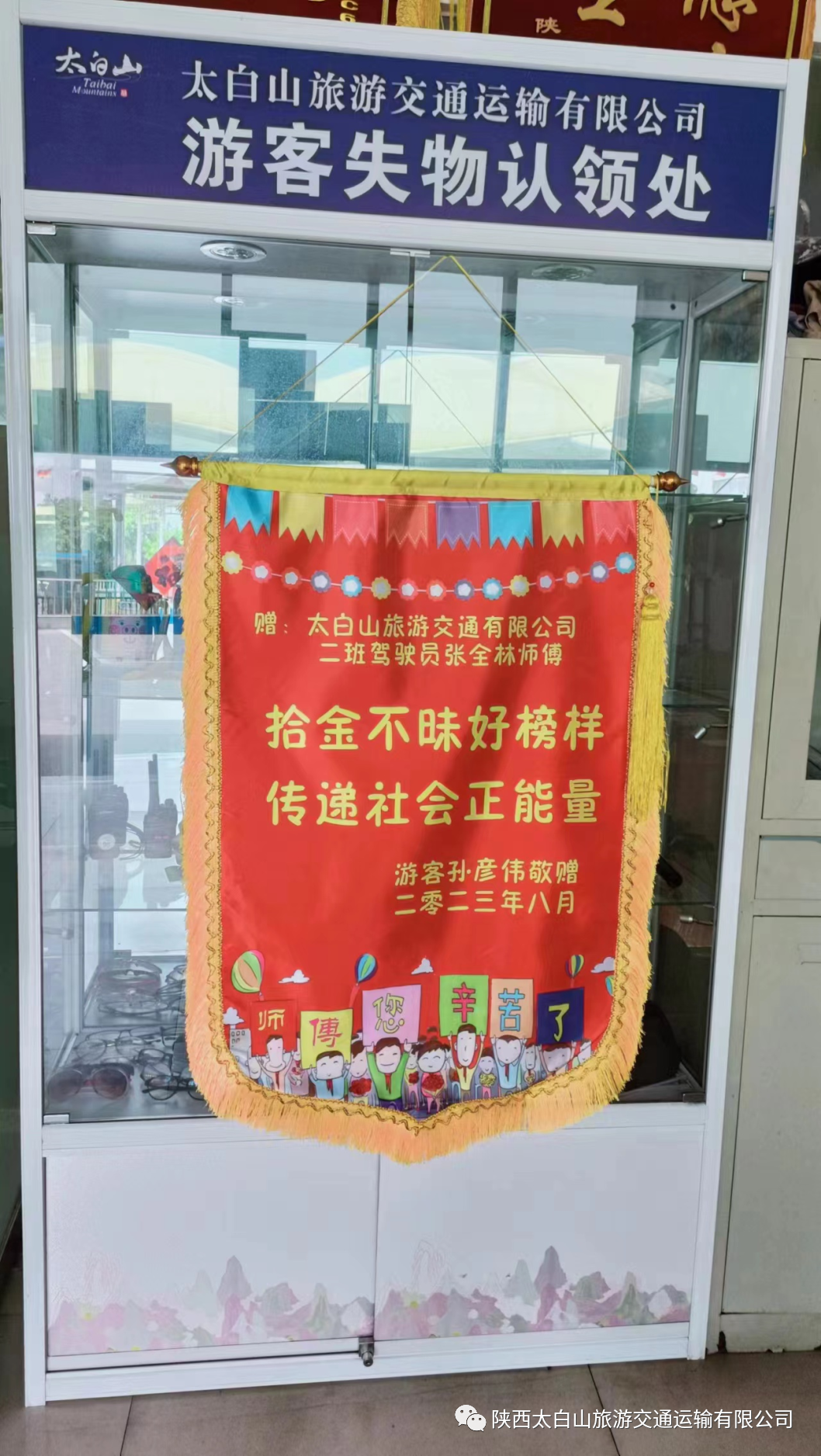 8月17日,游客孙彦伟将一面写有“拾金不昧好榜样,传递社会正能量”的锦旗赠送给交通公司二班驾驶员张全林师傅,对张师傅捡到并归还遗失物品深表谢意。