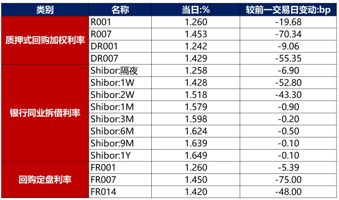 1月4日,跨年过后,资金面宽松无虞,主要回购利率普遍大幅下行。当日DR001下行9.06bp至1.242%,DR007下行55.35bp至1.429%。
