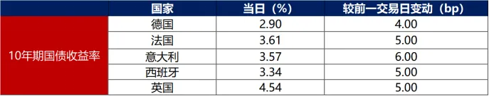 1月2日,主要欧洲经济体10年期国债收益率普遍上行。其中,德国10年期国债收益率上行4bp至2.90%,法国、意大利、西班牙、英国10年期国债收益率分别上行5bp、6bp、5bp和5bp。