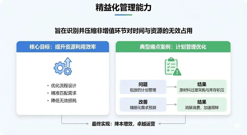 精益化管理能力:决定非增值环节的时间占比、资源占比(比如因计划管理差,导致原辅料过多采购等)