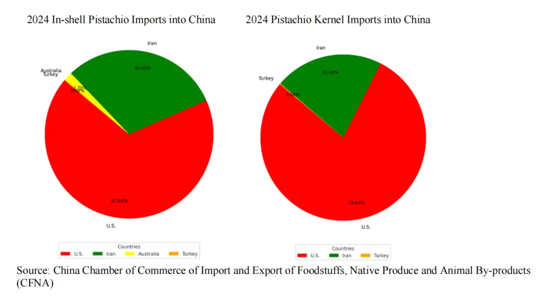 由于种植碧根果、开心果和巴旦木等受欢迎品种的难度较大,加上树坚果市场快速增长,中国成为坚果净进口国已超过十年。除了核桃和榛子,我国的树坚果需求都超过国内供应。2024年,中国从四个国家进口了133,744吨开心果,成为全球第二大开心果进口国。美国是主要供应国,对华出口量为90,675吨,占中国进口总量的68%。伊朗是第二大出口国,向中国出口40,721吨,占比31%,其次是澳大利亚(2,257吨)和土耳其(91吨)。