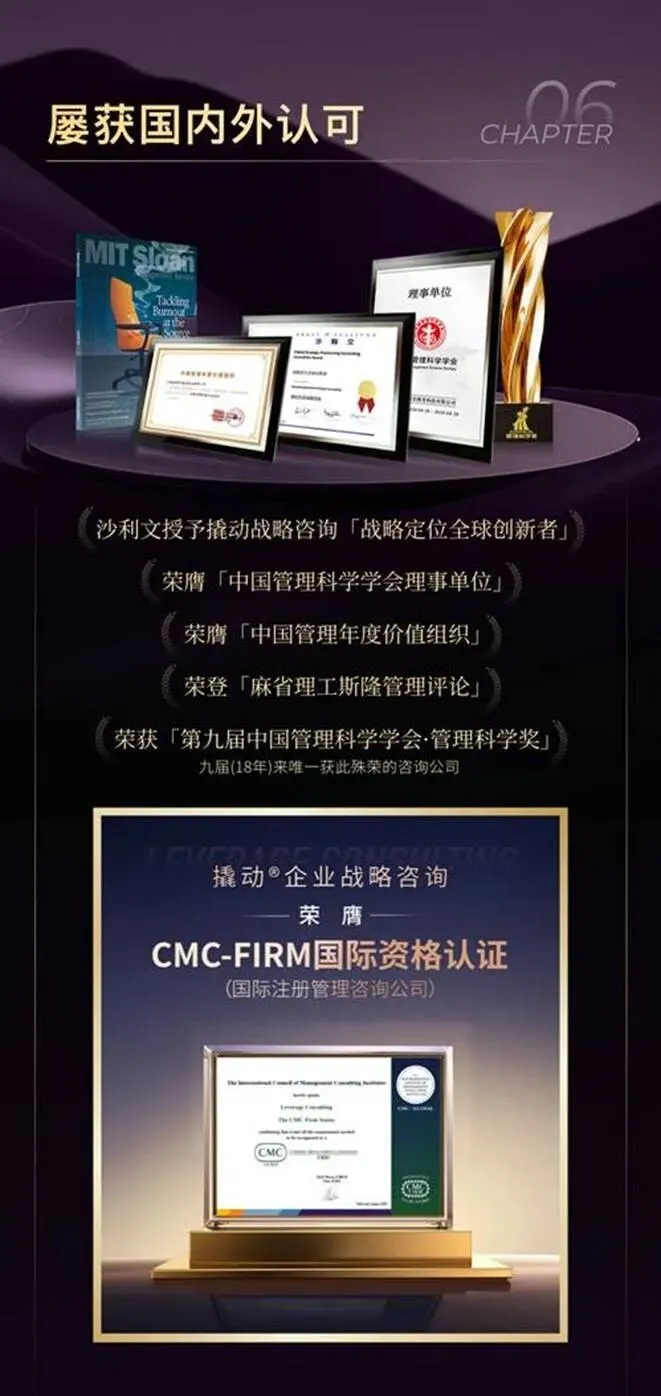 凭借可落地、可复制的实战经验与服务模式,撬动战略咨询被沙利文授予「战略定位全球创新者」,同时也是18年来唯一获中国“管理科学奖”的咨询公司。撬动战略咨询团队10年来已助力62家企业突破性增长,以实战赢得无数认可。