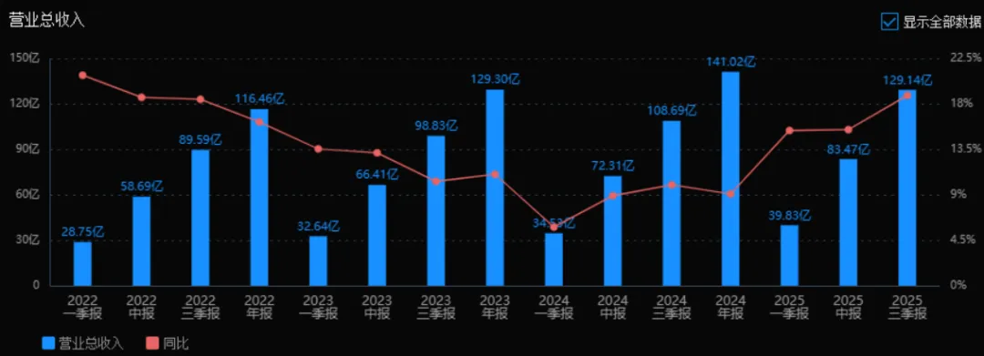2025年三季度的营业总收入为 129.14亿元,相较于2024年三季度的108.69亿元,增长 18.82%。评价: 营业总收入持续增长,2025年增速明显加快,显示出公司业务扩张态势良好。