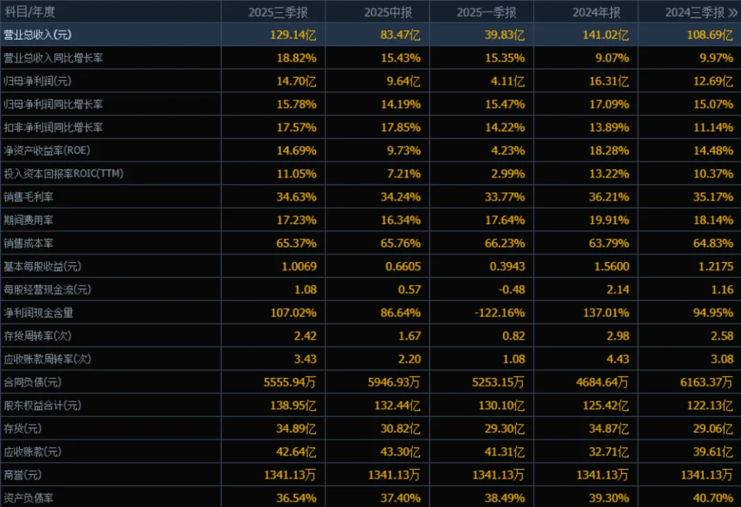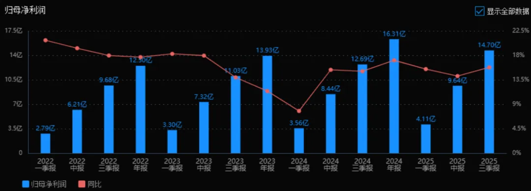 2025年三季度的归母净利润为 14.70亿元,相较于2024年三季度的12.69亿元,增长 15.78%。评价: 净利润持续稳定增长,与收入增长趋势基本一致,说明公司盈利能力稳健。