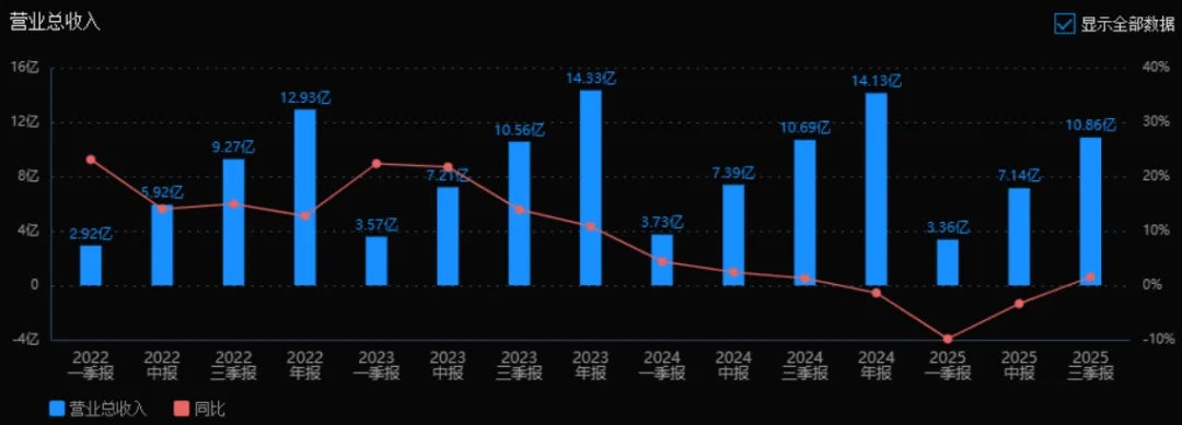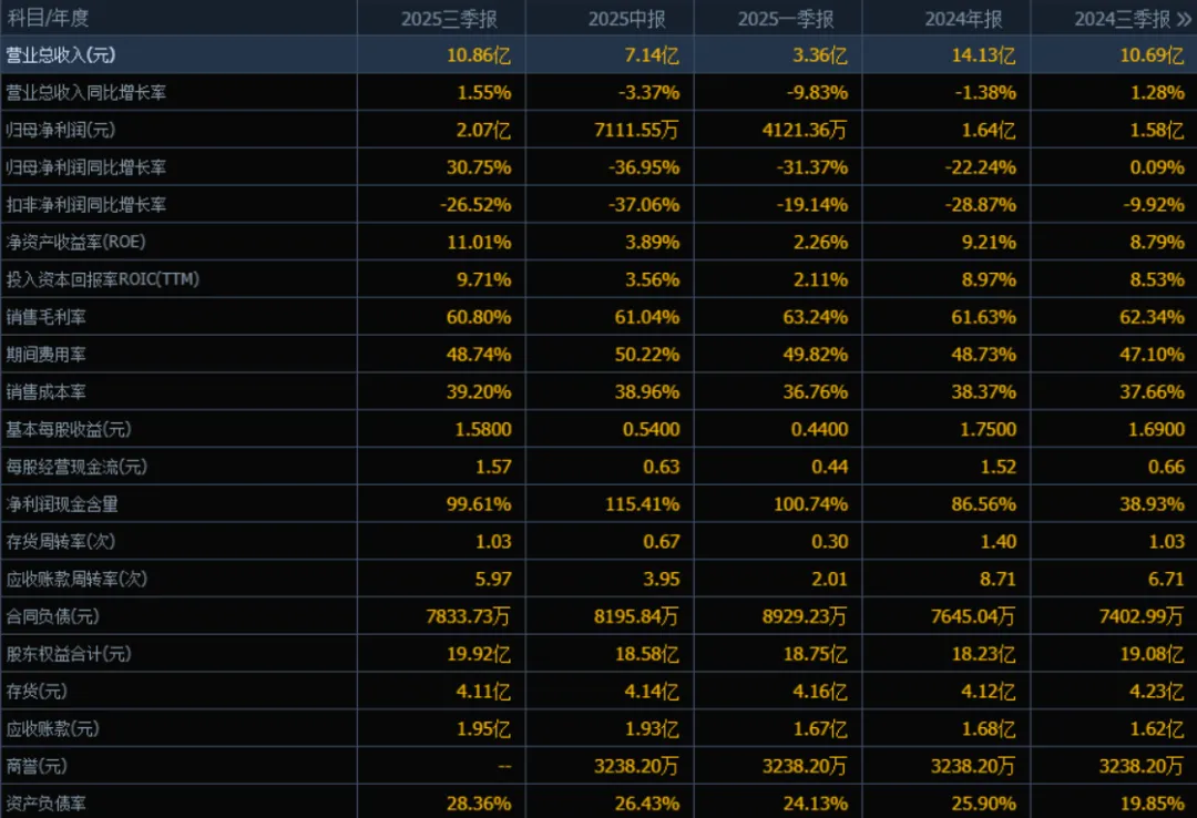 营业总收入:2025年三季度营业总收入为10.86亿元,相较于2024年三季度(10.69亿元)增长1.55%。评价:收入微幅增长,说明公司主营业务基本保持稳定,但增速较低,增长动力不强。