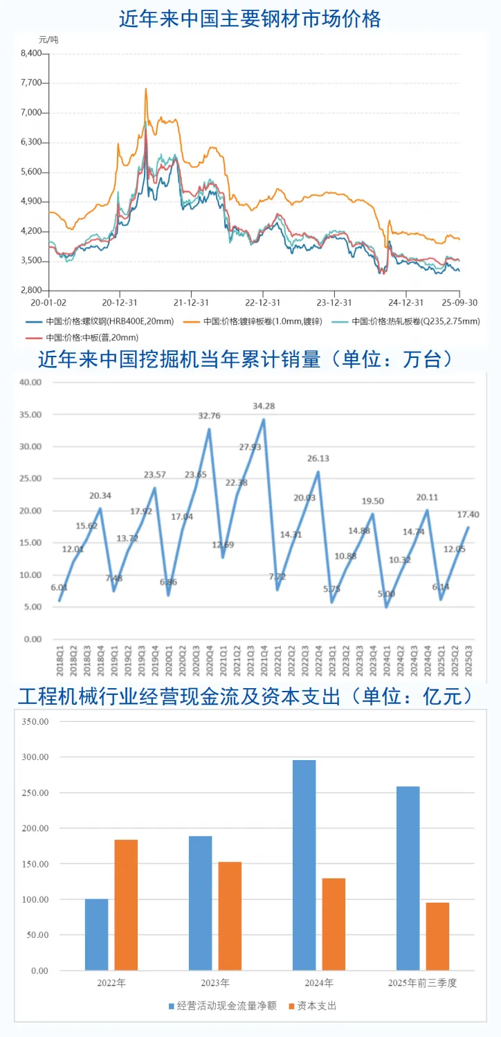 2025年以来,工程机械行业呈现稳健向好的发展态势,整体盈利能力增强,经营活动现金流增长明显,行业资产报酬率保持稳定,现金回收情况总体良好,整体反映出行业增长的积极信号;同时,行业资本支出逐年下降,企业逐步控制投资规模、优化资本配置,或逐渐进入投资回报期。