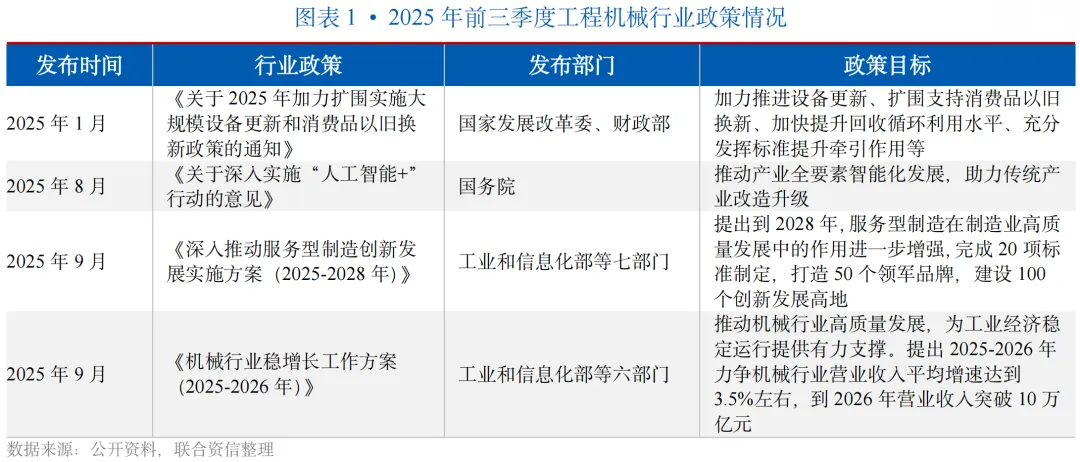 行业政策方面,2025年以来,工程机械行业相关产业政策逐步落地。2025年1月,国家发展改革委和财政部印发《关于2025年加力扩围实施大规模设备更新和消费品以旧换新政策的通知》,加力推进设备更新、扩围支持消费品以旧换新,重点支持高端化、智能化、绿色化设备的应用,同时政策配套了标准提升、循环利用等措施,将直接扩大工程机械行业下游需求,引导产业方向,规范和拓展现有市场。2025年8月,国务院印发《关于深入实施“人工智能+”行动的意见》,加快工业软件创新突破,将AI与工业互联网融合,推动工程机械装备从“功能机”向“智能体”演进。2025年9月,工业和信息化部等六部门联合印发《机械行业稳增长工作方案(2025-2026年)》,提出2025-2026年力争机械行业营业收入平均增速达到3.5%左右,到2026年营业收入突破10万亿元,该政策作为顶层设计,为包括工程机械在内的整个机械行业设定了明确的发展目标和工作方向。