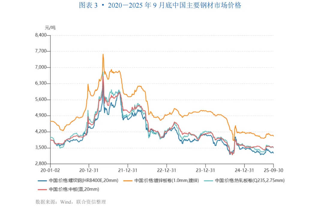 从供应端看,工程机械行业的上游主要是钢、铁、液压件以及发动机等原材料与核心零部件。根据中商产业研究院数据,钢材约占工程机械成本的30%。钢、铁价格的涨跌直接影响到工程机械制造企业的生产成本,进而影响工程机械制造企业的盈利能力。2025年前三季度,中国钢材价格整体呈现“波动下行”的发展态势,成本下降有助于改善工程机械企业毛利率。截至2025年9月底,中国螺纹钢(型号:HRB400E,20mm)、镀锌板卷(型号:1.0mm镀锌)、热轧板卷(型号:Q235,2.75mm)和中板(型号:普20mm)的市场价格分别为3260元/吨、4003元/吨、3496元/吨和3519元/吨,较2024年9月底分别下降17.20%、7.49%、8.27%和6.31%,主要原材料成本压力有所缓解。