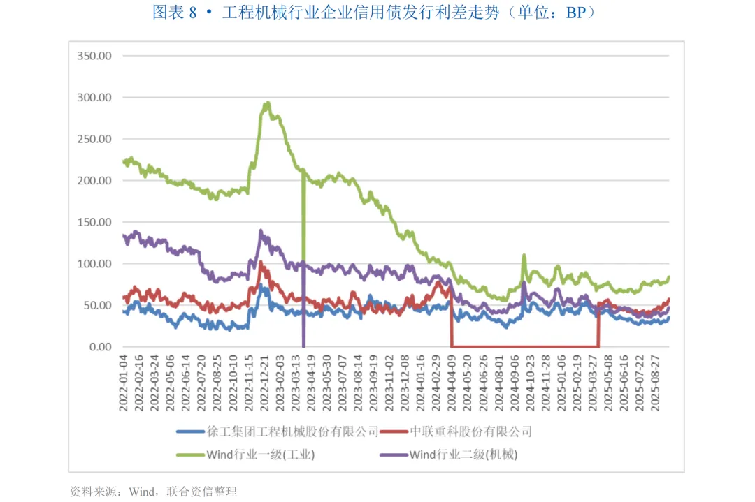 2025年前三季度,工程机械行业企业积极盘活应收账款等存量资产进行融资,发行信用债券规模较上年同期有所增长,发行期限以1~3年为主,行业利差水平较低且走势相对稳定。行业存续债券于2026年到期规模占比较高,存在一定集中偿付压力。