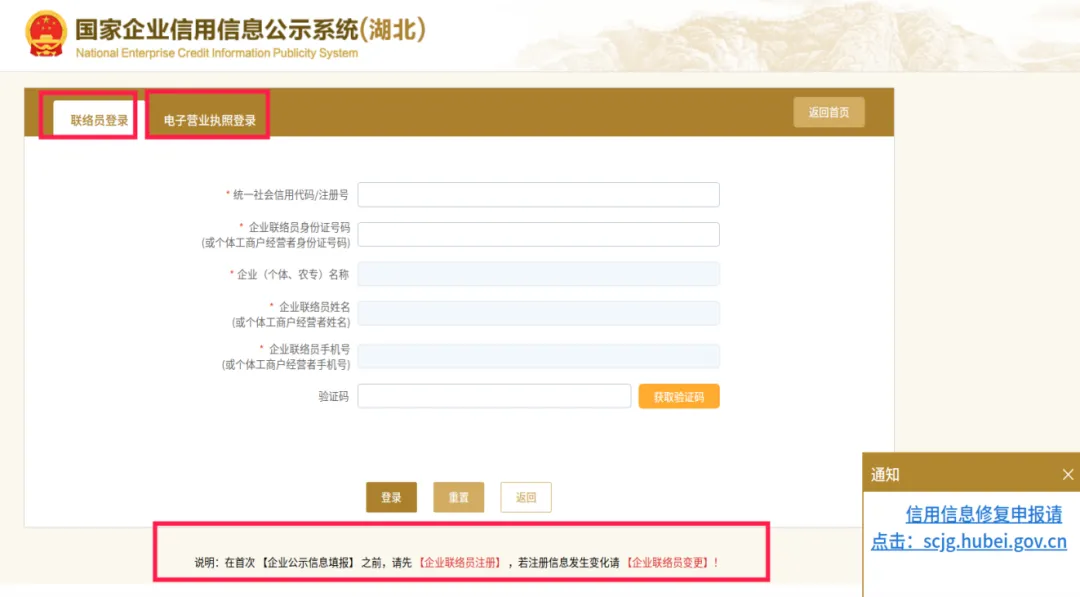 进入“联络员登录”或者“电子营业执照登录”页面,