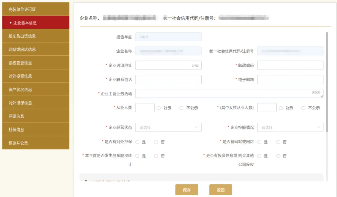 填写基本信息,包括通信地址、邮政编码、联系电话、电子邮箱、存续状态、网址、网站信息均为报送时的信息,其余信息为所报告年度12月31日的信息。如果有网站、对外担保、股东股权转让、投资信息,就点对应信息“是”。如果没有网站、对外担保就点“否”字前的圆点。填写完后点“保存”。