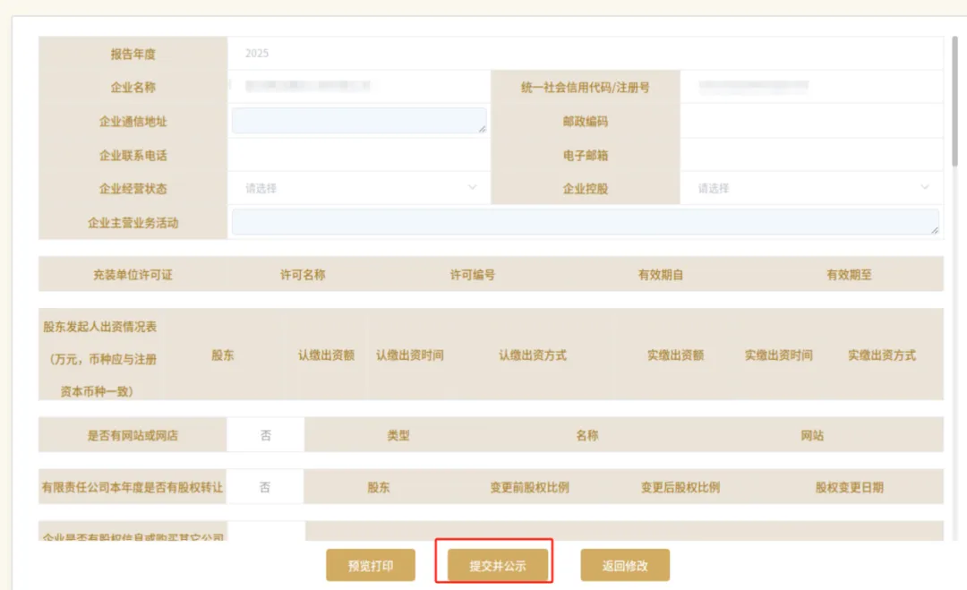提交并公示后,如发现有部分内容填写错误的,在6月30日前可以登录年报系统页面进行修改。若发生修改,务必在修改后再次点击“提交并公示”,否则系统将显示为未完成年报状态!