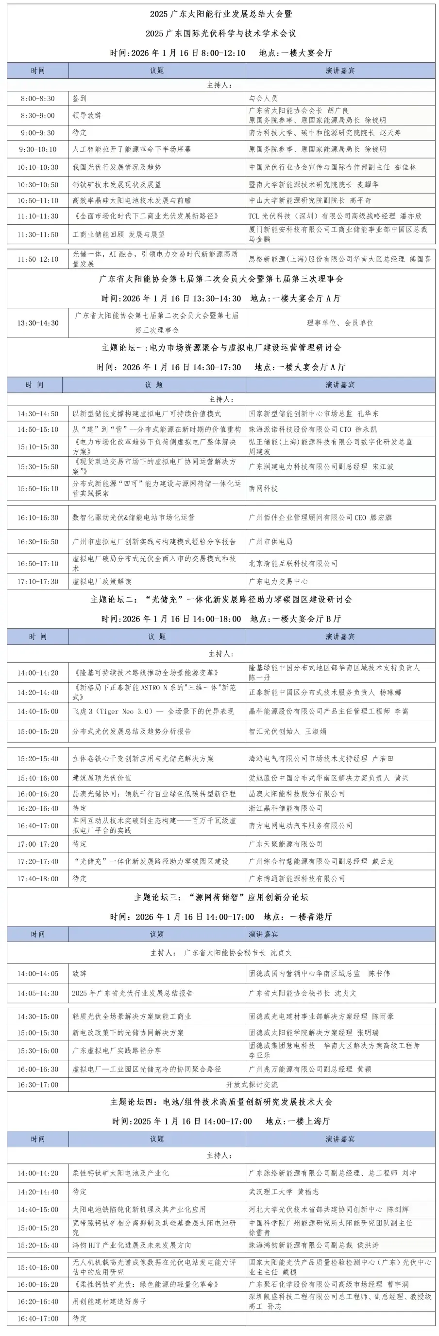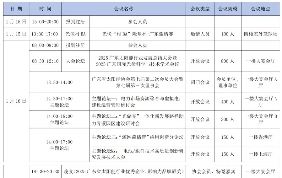 为更好地推动我省太阳能技术和产业的高质量发展,再进一步促进“光储充”一体化、虚拟电厂建设运营发展,引导太阳能光伏技术创新与产学研交流合作,活跃新技术、新理论的交流推广,培育新质生产力,广东省太阳能协会联合广东省能源研究会、中山大学、华南理工大学、暨南大学和南方科技大学于2026年1月16日在广州举办“2025广东太阳能行业发展总结大会暨2025广东国际光伏科学与技术学术会议”,同期举办多场多主题论坛,具体方案如下: