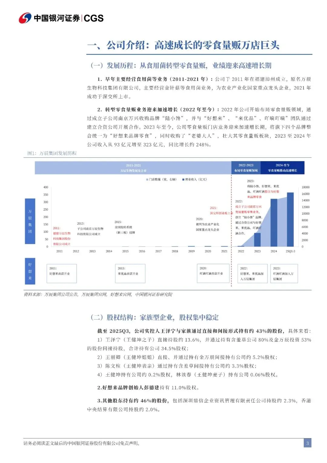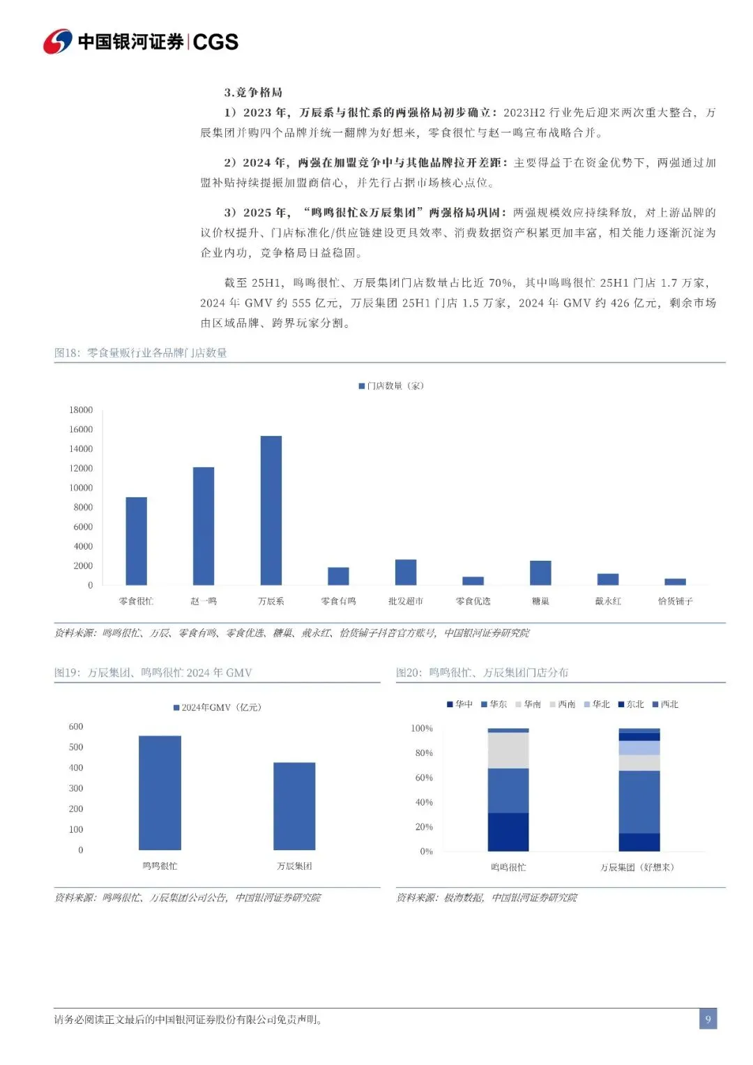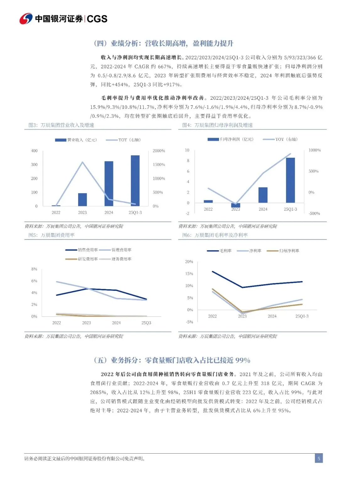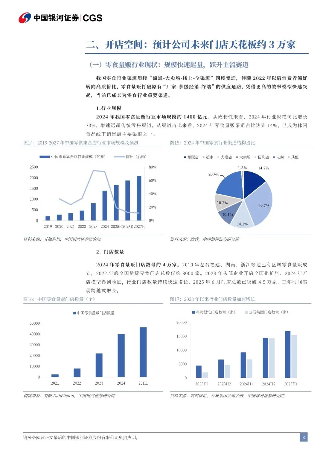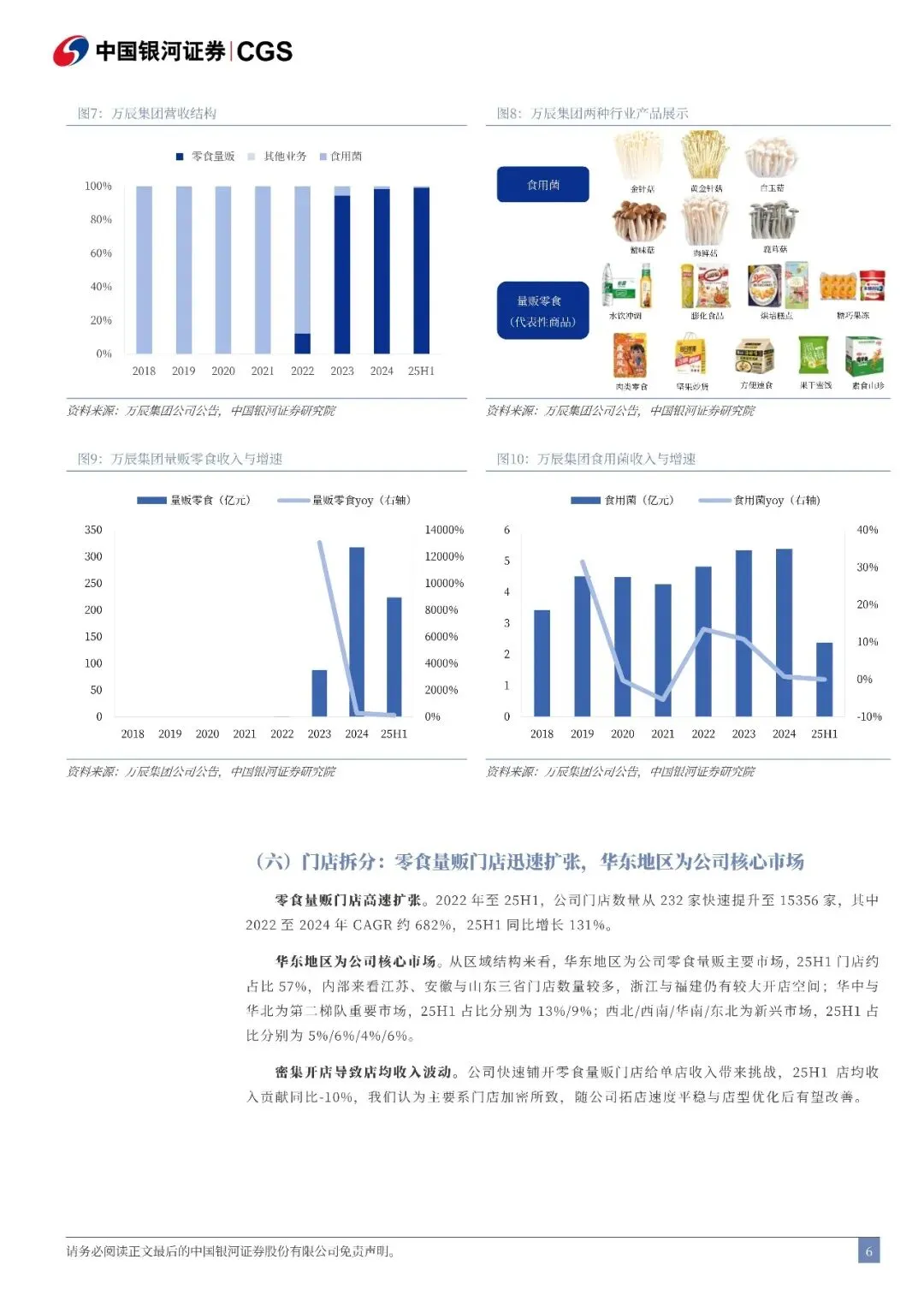 公司介绍:高速成长的零食量贩万店巨头。公司早年主营金针菇业务,2022年开始转型重点布局零食量贩门店,业绩迎来高速增长期,收入从 2022 年 5.5亿元增长至 2024 年 323 亿元(CAGR 约 667%),2025 年前三季度延续高增趋势(同比+77%);盈利能力亦呈现提升趋势,净利率从 2023 年-1.6%提升至 2024 年 1.9%,2025 年前三季度改善趋势延续(净利率同比+2.7pcts)。截至 25H1,公司门店规模已超过 1.5 万家,成为零食量贩万店巨头,产品主打性价比,以下沉市场加盟门店为主,聚焦华东与北方市场。