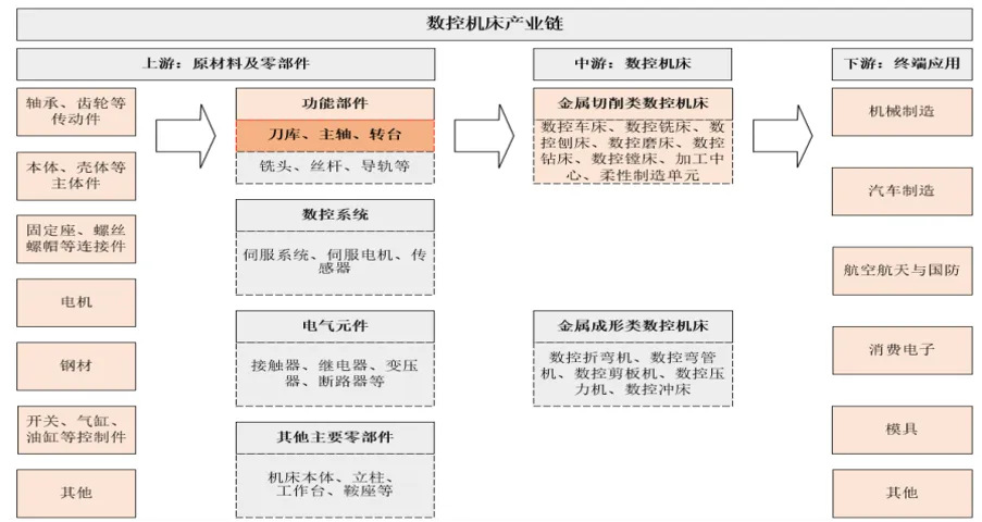机床产业链上游环节主要包括钢材等刀库,转台,主轴,伺服系统等零部件;中游环节主要包括金属切割机床,金属成型机床等不同类型的主机制造;下游环节工业制造主要应用场景,主要包括汽车,航空航天和消费电子等领域。