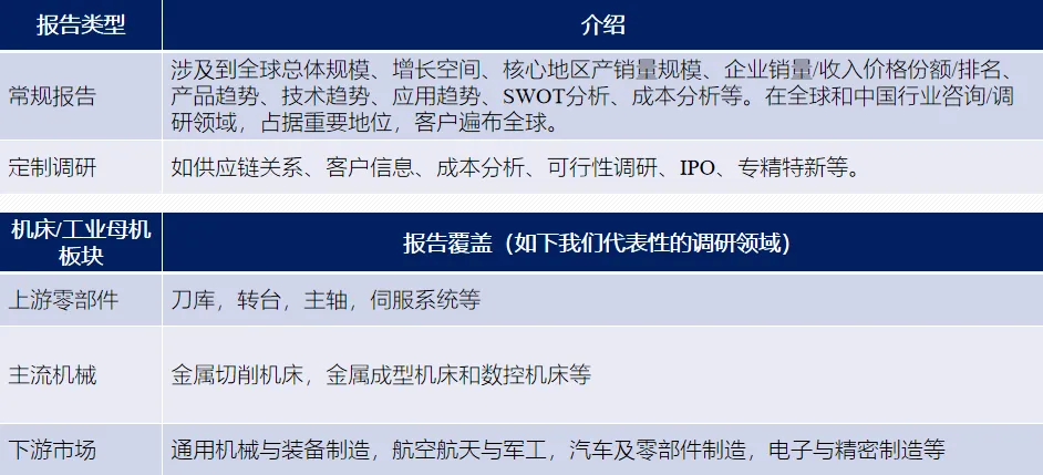 QYResearch提供机床产业链各细分产品调研报告,包括常规报告和定制调研,涵盖机床产业链及下游各个细分领域产品。