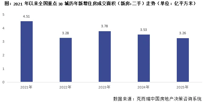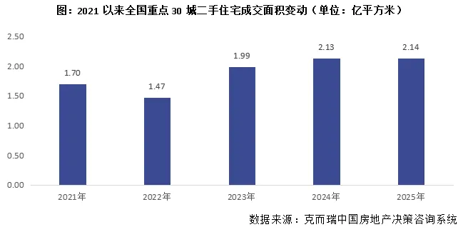 据克而瑞监测数据显示,2025年全国重点30城市二手住宅累计成交面积约2.14亿平方米,为新房面积的1.85倍,同比持平微增0.2%,再次创新2021年行业调整以来规模新高。