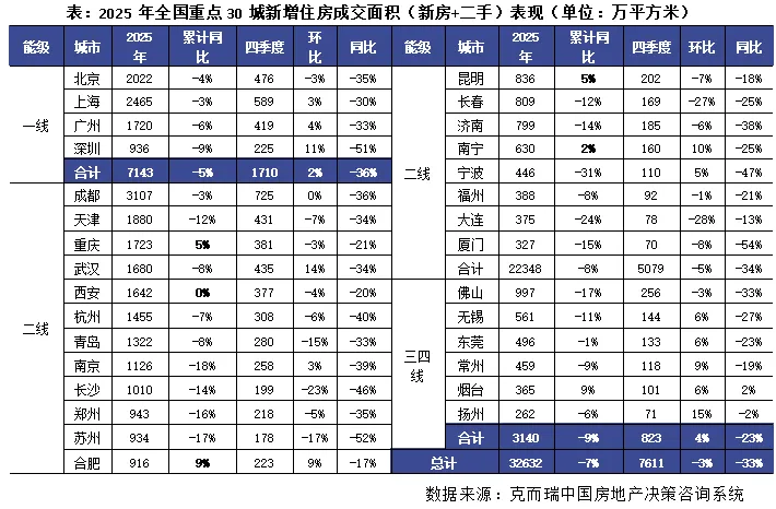 首先,整体市场量稳价跌、以价换量寻求新平衡。以克而瑞监测数据显示,2025年全国30个重点城市新增住房成交面积约3.26亿平方米,同比降7%,绝对量与2022年基本相当,为行业调整以来四年中间水平,说明居民住房有效需求基本稳定。与此同时,房价下行压力犹存,但跌幅趋缓。70个大中城市新建商品住宅销售价格指数在2025年大部分时间处于环比微跌或持平状态。二手房市场价格下行趋势较为明显,市场预期仍偏谨慎。然而,部分核心城市核心区域的优质项目已率先止跌企稳。购房者 “精打细算”成为新常态,购房预期和行为发生深刻变化,高度重视个人未来收入预期的稳定性,对价格的敏感度极高,追求产品力和极致性价比,绿色、智能、健康、安全的产品将获得溢价,社区配套和服务的重要性凸显。