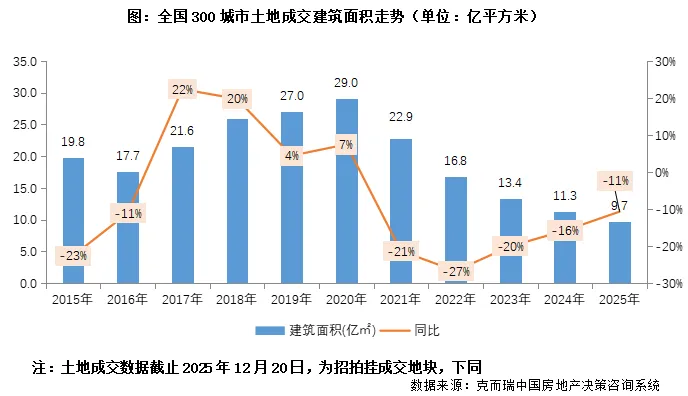 2025年,土地市场持续践行去库存目标,截至2025年12月25日,全国300城土地成交建筑面积同比下滑11%。预计全年成交建面下降至10亿平方米左右,可售土地建面低于商品房成交。就城市视角来看,千万平方米级别的城市数量进一步减少,地方正在进一步收缩非市场化土地的出让规模。土拍热度方面,得益于杭州、成都、上海等地出让了众多优质新规宅地的拉动,2025年上半年成交了大量热门宅地,全年溢价率达到5.3%,实现低位回升。