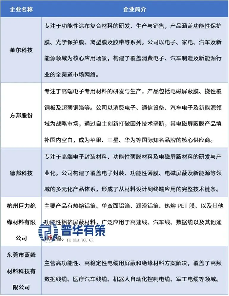 行业内主要企业有莱尔科技、方邦股份、德邦科技、杭州巨力绝缘材料有限公司、东莞市蓝姆材料科技有限公司等。