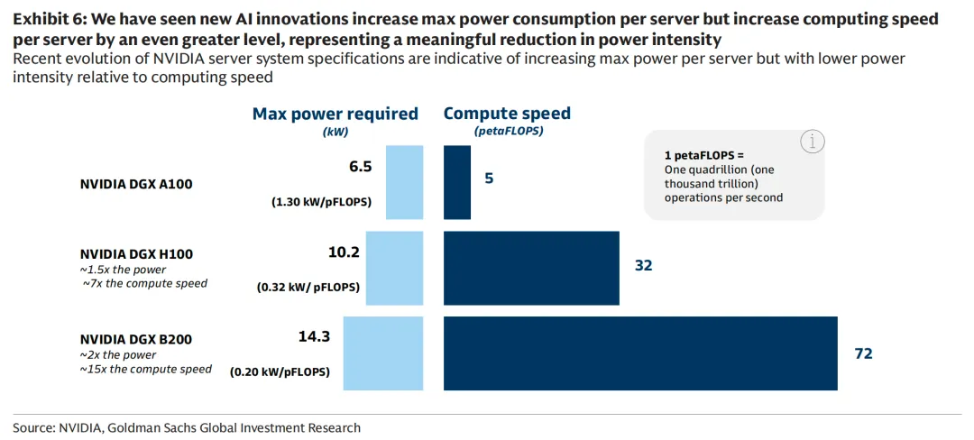 - 技术进步:NVIDIA最新服务器最大功耗虽增加,但计算速度提升更快,单位计算量的功耗强度下降