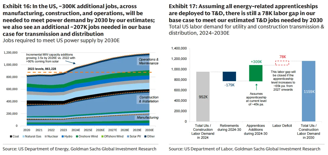- 需求规模:为满足2030年电力需求,美国需新增约51万个工作岗位(电力+电网),欧洲需25万个