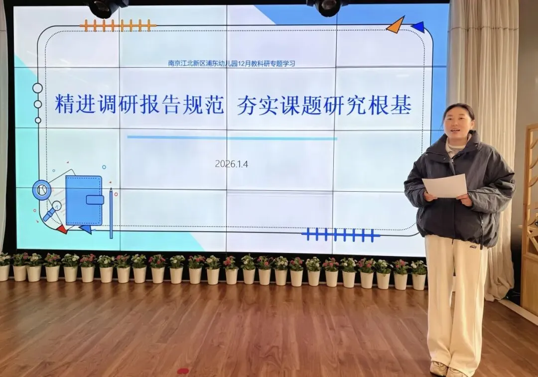 为深入贯彻落实新时代教育科研工作要求,夯实幼儿园教师课题研究专业基础,提升教科研成果质量,以高质量教科研引领幼儿园教育教学实践创新发展。2026年1月4日,南京江北新区浦东幼儿园在教科室副主任张美娟老师组织下开展了以“精进调研报告规范 夯实课题研究根基”为主题的专题培训活动。