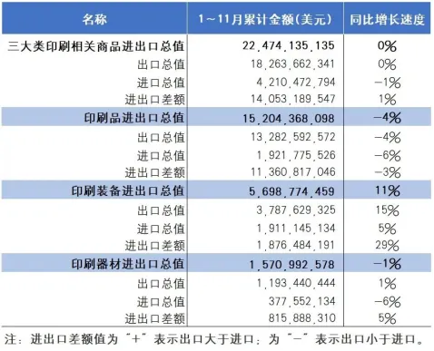 2025年1~11月,国内印刷品进出口152.04亿美元(同比下降4%)、印刷装备进出口56.99亿美元(同比增长11%)、印刷器材进出口15.71亿美元(同比下降1%)。