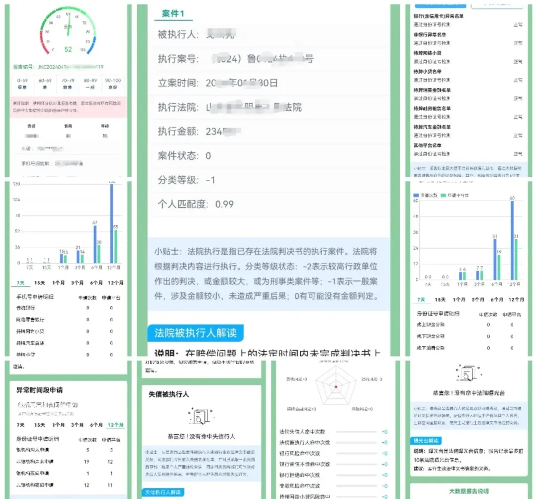 抓重点:优先关注信用评分、黑名单命中次数、逾期记录、法律案件这4个核心指标,快速把握客户信用轮廓,不被次要信息干扰。