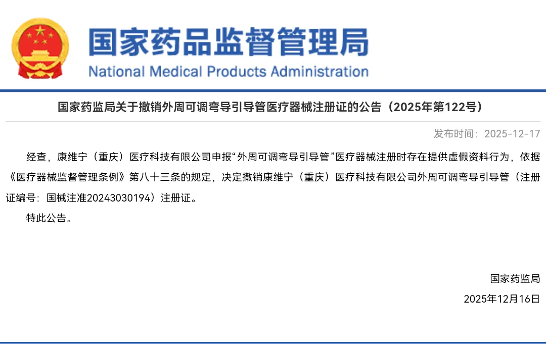 国家药监局关于撤销外周可调弯导引导管医疗器械注册证的公告(2025年第122号)