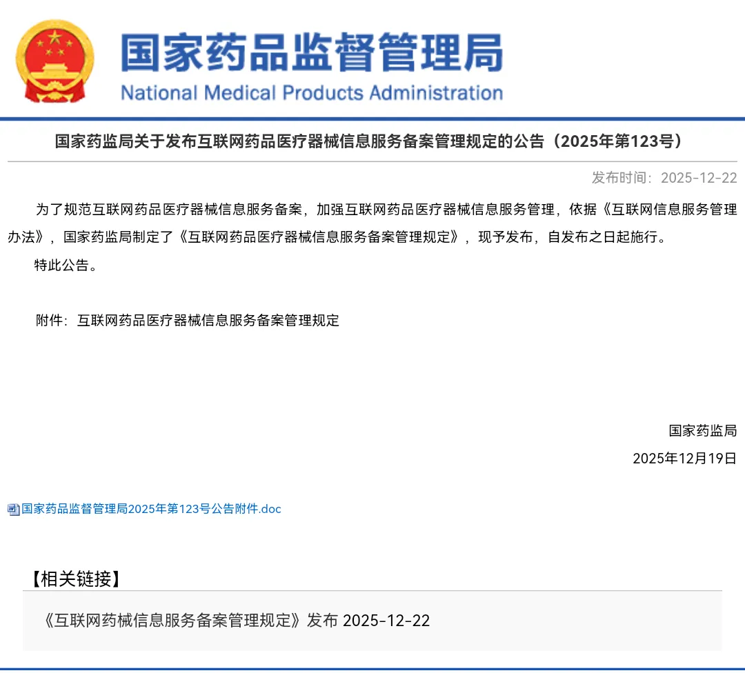 国家药监局关于发布互联网药品医疗器械信息服务备案管理规定的公告(2025年第123号)