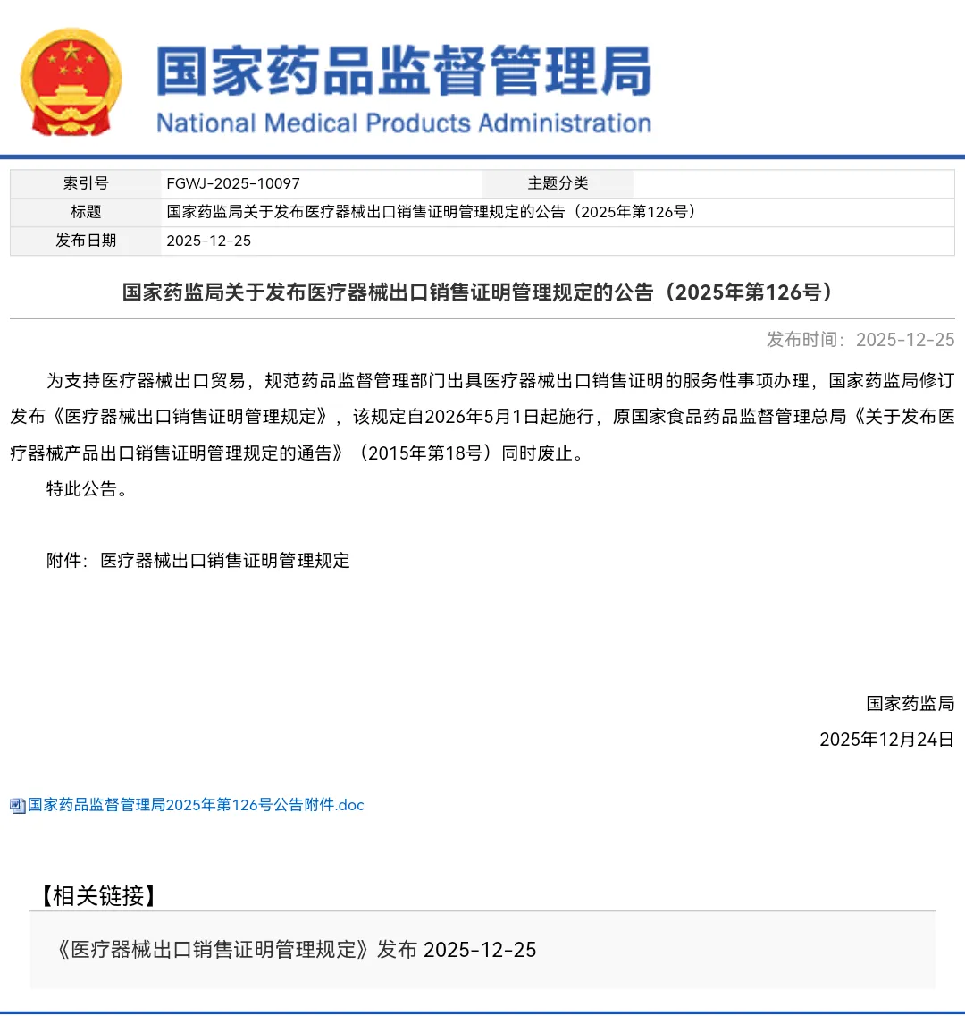 国家药监局关于发布医疗器械出口销售证明管理规定的公告(2025年第126号)