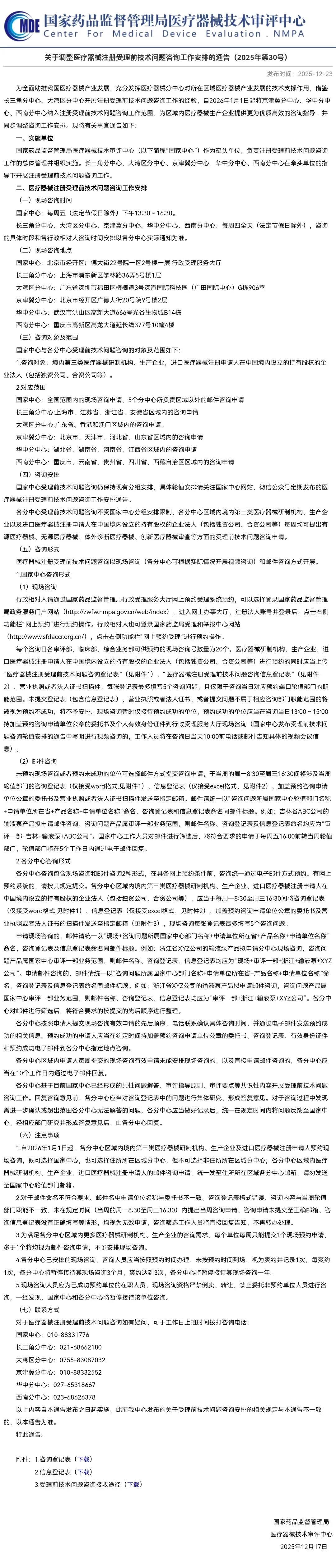 关于调整医疗器械注册受理前技术问题咨询工作安排的通告(2025年第30号)
