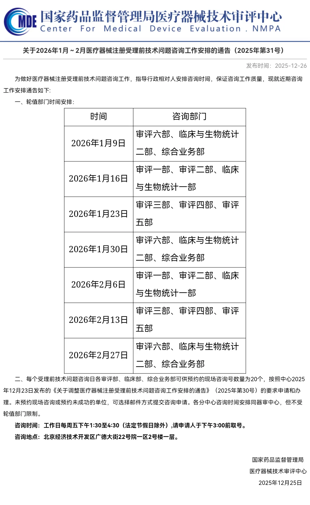 关于2026年1月~2月医疗器械注册受理前技术问题咨询工作安排的通告(2025年第31号)