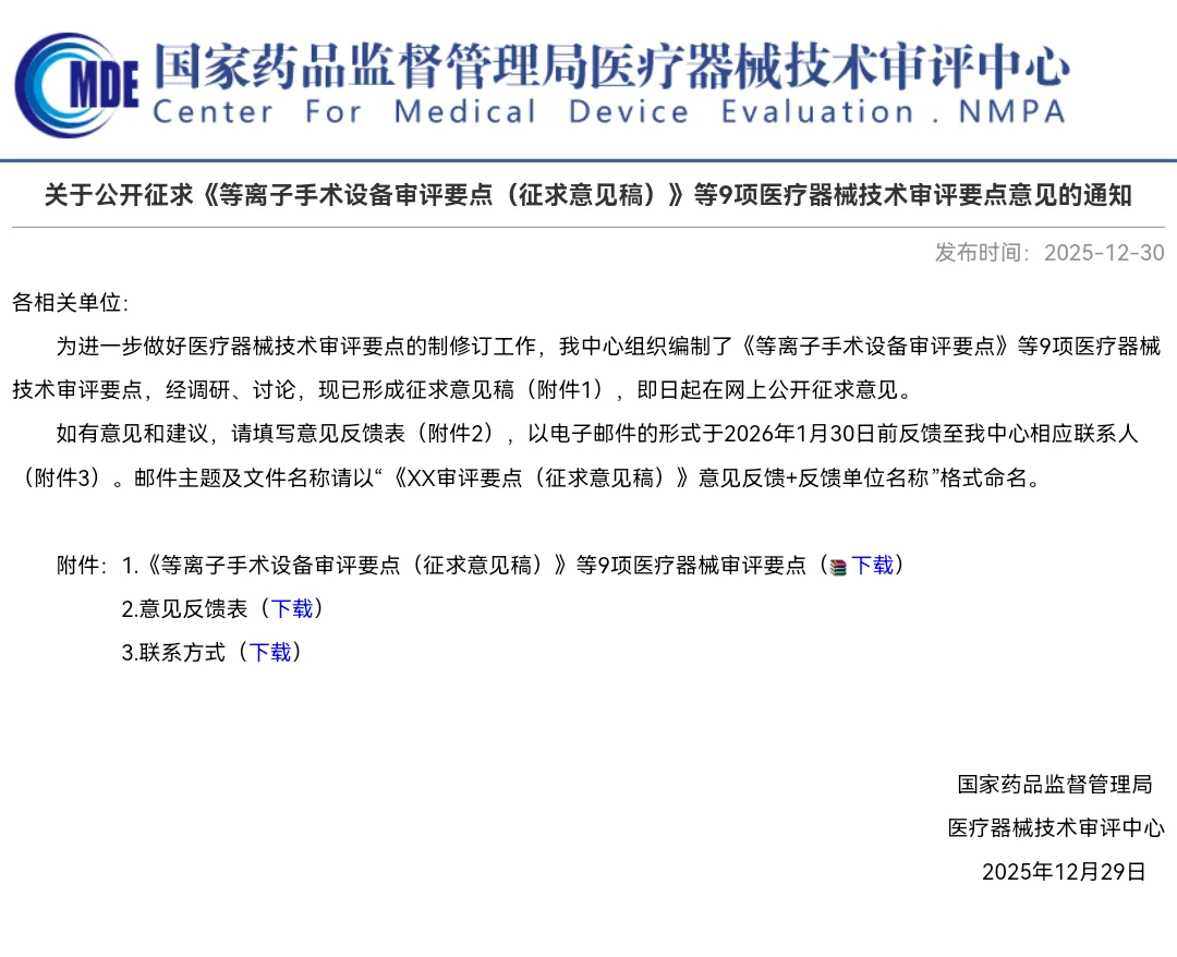 关于公开征求《等离子手术设备审评要点(征求意见稿)》等9项医疗器械技术审评要点意见的通知