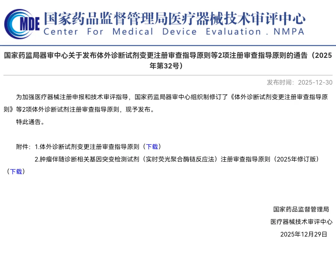 国家药监局器审中心关于发布体外诊断试剂变更注册审查指导原则等2项注册审查指导原则的通告(2025年第32号)